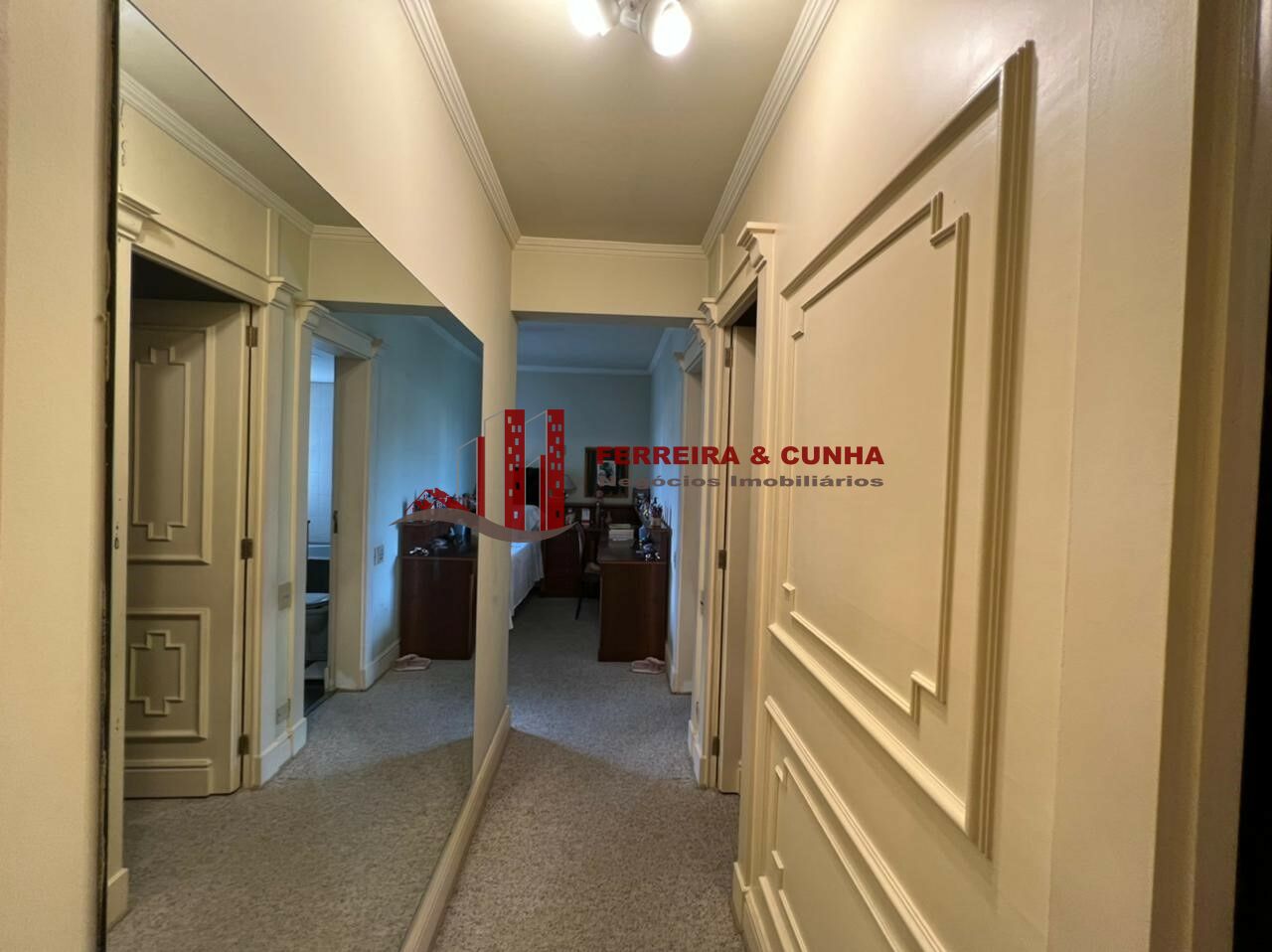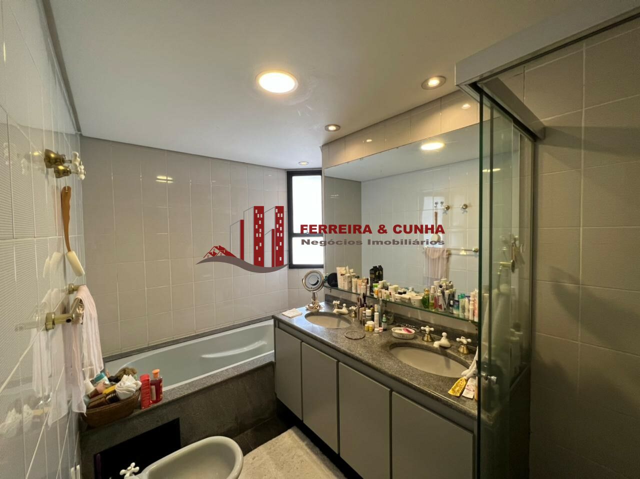 Suíte máster com Home Office embutido, walk in closet (Sr e Sra), ventilador de teto Hunter e ar-condicionado; banheiro com duas pias, ducha, banheira, vaso, bidê e varanda privativa;