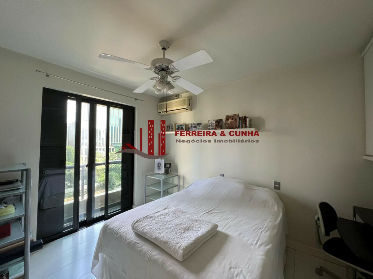 2 suítes completas com armários embutidos, ventiladores de teto Hunter, ar-condicionado e varandas privativas;