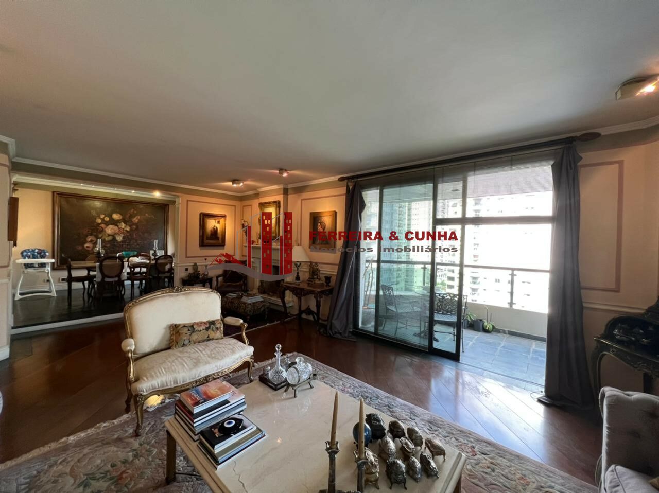 Sala de jantar ampla conectada à sala de estar, com varanda privativa;